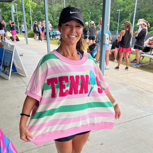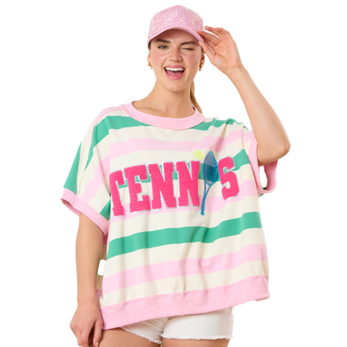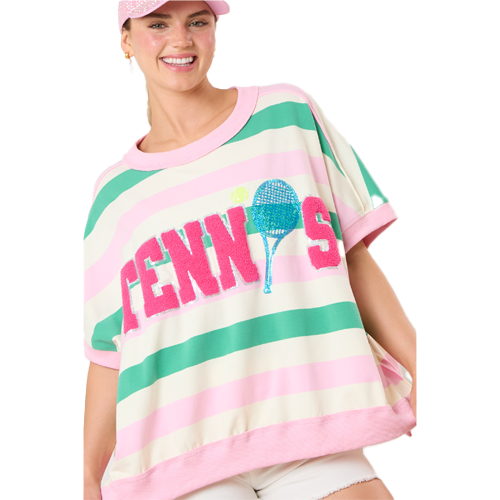 Boxy oversized tennis top is adorned with chenille and sequined "Tennis". Pretty in pink and green this cute top is over-sized and a bit "slouchy", but super cute and comfy. While not for the faint of heart, this festive piece makes a perfect statement for your next tennis event! Available in ladies sizes S, M, L